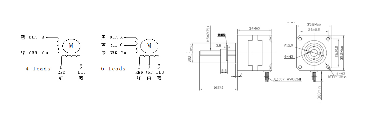 | 电机 型号 | 步长 (MM/STEP) | 机身长 (MM) | 相电压 (V) | 相电流 (A) | 相电阻 (Ω) | 相电感 (MH) | 静转矩 (KG.CM) | 引线数 (NO.) | 转动惯量 (G.CM2) | 定位力矩 (G.CM) | 重量 (KG) |